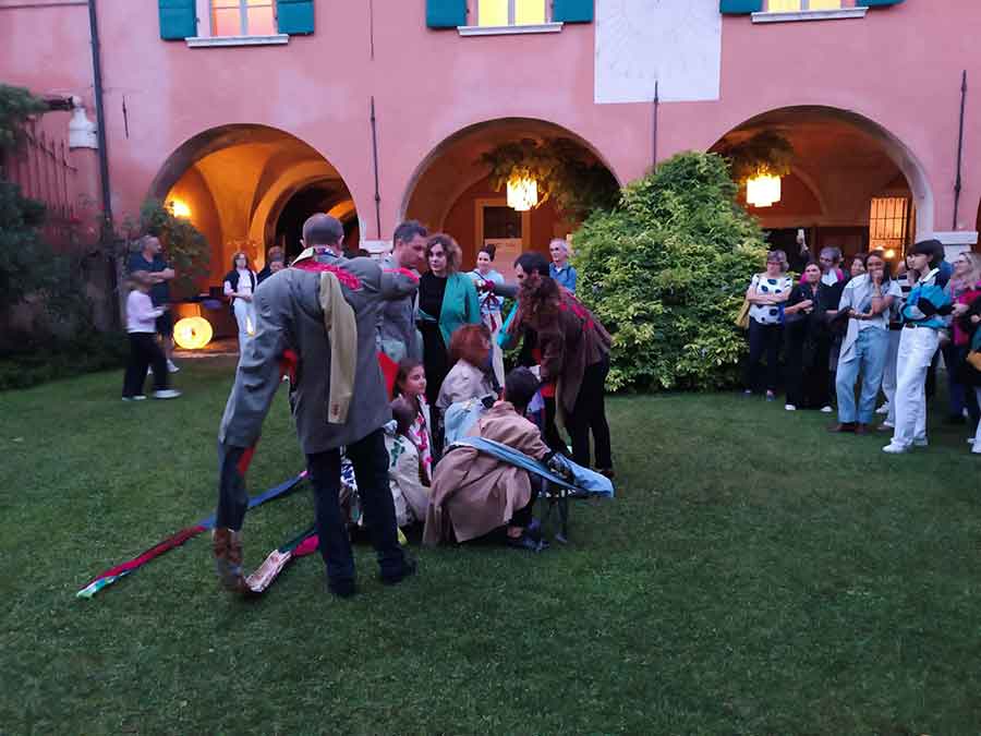 Coppie di performer, dislocate in spazi diversi, attivano brevi scambi dialogici. Non c’è un ordine narrativo, il pubblico fa il montaggio muovendosi e incontrando le coppie. Serve che il pulsante interattivo sia dentro ciascuno di noi e non parta al primo colpo, ma dopo. Mangrovie, un organismo vivente per metà immerso in acqua per metà fuori, tra l’acqua salata e quella dolce. Diradato, ma così fitto che può formare un’isola, un arcipelago, un continente. Un mostro senza capo né coda, pervasivo e senza un centro. Non c’è il prato. Non ci si può stendere sotto e godere dell’ombra. Digressioni e prolissità, la scultura, l’arte, il mondo, le parole. Un autoritratto per frammenti. Di cosa parliamo? Di cosa vale la pena parlare? Se disputiamo sul campo da gioco dell’arte, quali sono gli argomenti? Collettivo 10dieciventi20: Andrea Manni, Paola Bettini, Ester Bonetti, Matilda Manni, Stefania Caldognetto, Carlo Pardi, Simona Baccolo, Dora Lazzari, Irene Carta, Cristina Guerra, Maurizio Bettinzoli, Anajla Nofulla, Matteo Bertuetti. Costumi Mariella Butturini. Per facilitare il percorso verrà distribuito ai presenti un poster col testo delle parti recitate dai performer.